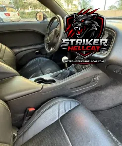 This 2015 Dodge Challenger SRT Hellcat is powered by a supercharged 6.2-liter V8 that has been updated with Alkycontrol methanol injection, Injector Dynamics fuel injectors, an Innovators West harmonic balancer, and American Racing Headers. Finished in Granite Crystal Metallic over black leather upholstery, the car features a six-speed manual transmission, a limited-slip differential, HID Air-Catcher headlamps, Brembo brake calipers, an SRT-tuned Bilstein suspension, Matte Black 20″ wheels, heated and ventilated front seats, a heated steering wheel, a Barton shifter, a Harman Kardon sound system, and a UConnect infotainment system with navigation.