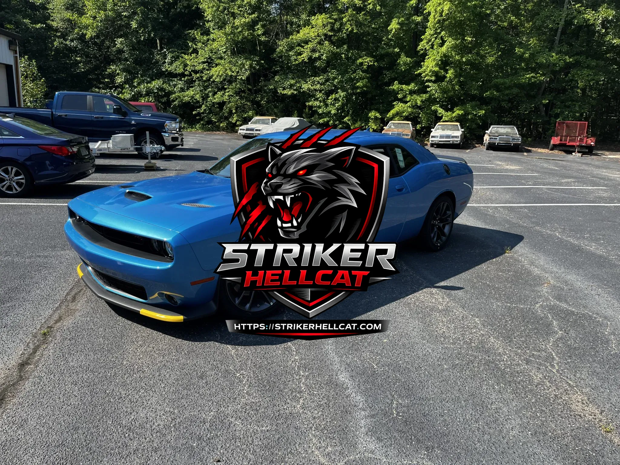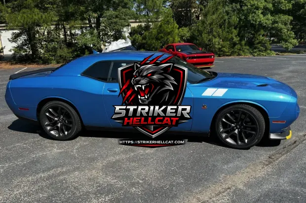This 2023 Dodge Challenger R/T Scat Pack Plus is powered by a 392ci V8 paired with a six-speed manual transmission, and it is finished in B5 Blue over black Nappa leather and Ruby Red Alcantara upholstery. It is equipped with 20″ Granite Crystal wheels, Brembo brake calipers, an SRT front splitter, a Performance hood, heated and ventilated front seats, Alpine speakers, and UConnect infotainment with navigation.